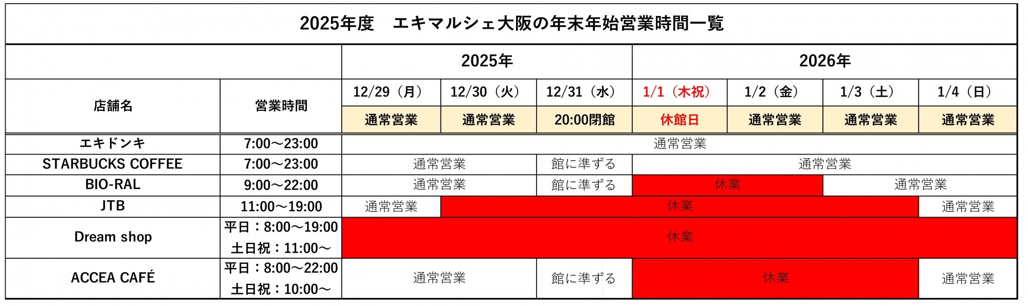 いつもエキマルシェ大阪をご利用いただき誠にありがとうございます。 年末年始につきまして、下記のスケジュールにて営業いたします。 お客様へはご不便をおかけいたしますが、何卒ご理解のほどよろしくお願いいたします。