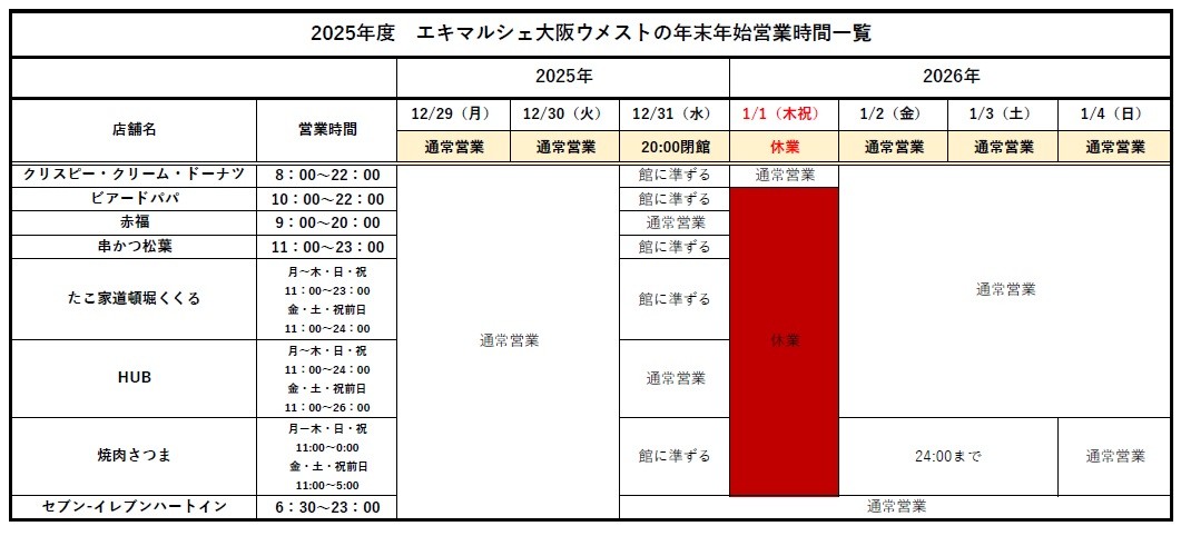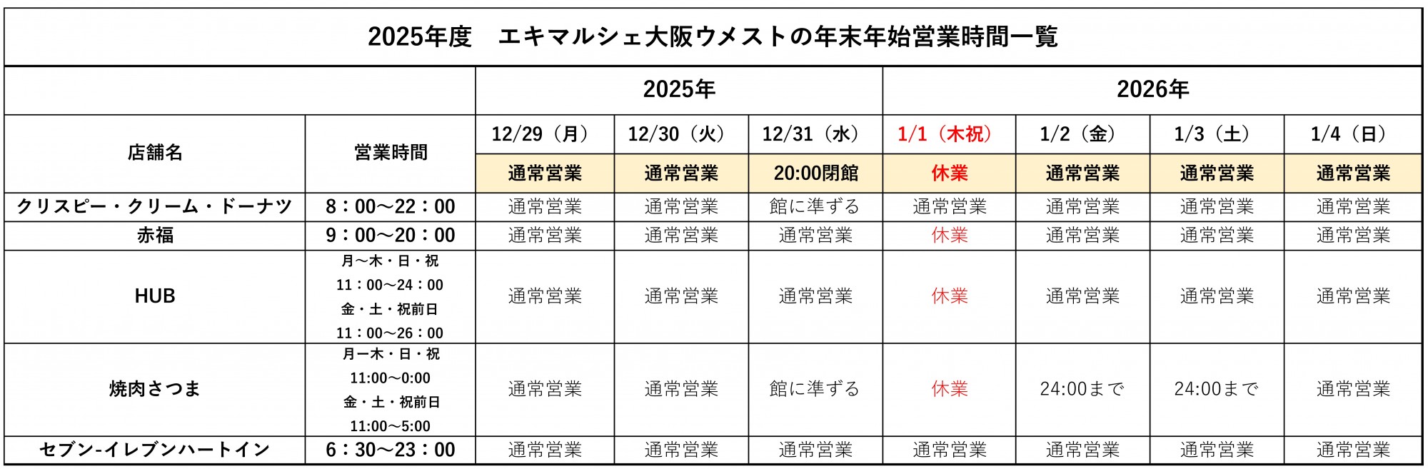 いつもエキマルシェ大阪ウメストをご利用いただき誠にありがとうございます。 年末年始につきまして、下記のスケジュールにて営業いたします。 お客様へはご不便をおかけいたしますが、何卒ご理解のほどよろしくお願いいたします。